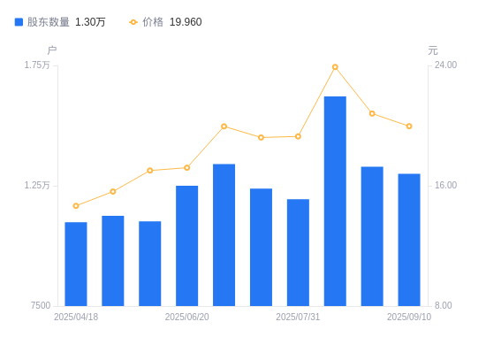近一年(2024年9月30日至2025年9月10日),英特科技A股股东户数从1.1万户,增加至1.3万户,增幅18.09%,区间股价上涨51.13%。