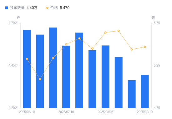 近一年(2024年9月20日至2025年9月10日),湖南投资A股股东户数从4.89万户,减低至4.4万户,降幅10.20%,区间股价上涨37.44%。