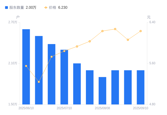 近一年(2024年9月10日至2025年9月10日),中兴商业A股股东户数从2.7万户,减低至2万户,降幅25.93%,区间股价上涨66.98%。