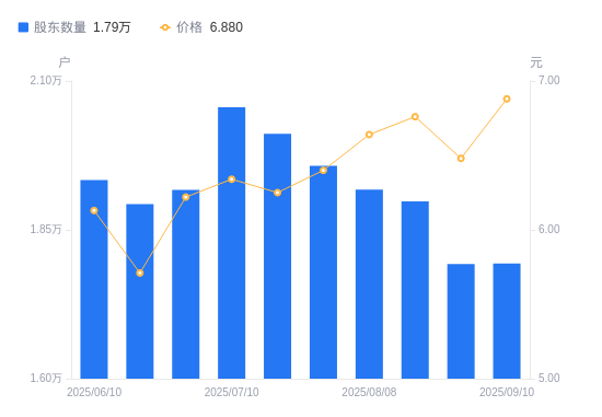 近一年(2024年9月30日至2025年9月10日),龙利得A股股东户数从1.99万户,减低至1.79万户,降幅10.04%,区间股价上涨52.89%。