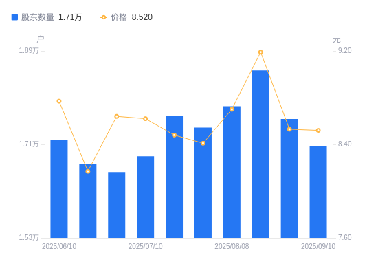 近一年(2024年9月10日至2025年9月10日),上海艾录A股股东户数从8837户,增加至1.71万户,增幅93.06%,区间股价下跌2.18%。