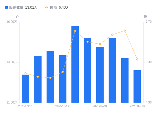 近一年(2024年9月13日至2025年8月29日),天海防务A股股东户数从10.42万户,增加至13.76万户,增幅32.13%,区间股价上涨103.86%。