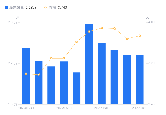 近一年(2024年9月20日至2025年9月10日),扬子新材A股股东户数从1.82万户,增加至2.28万户,增幅25.08%,区间股价上涨41.67%。