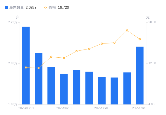 近一年(2024年9月10日至2025年9月10日),宏创控股A股股东户数从2.41万户,减低至2.08万户,降幅13.71%,区间股价上涨247.61%。