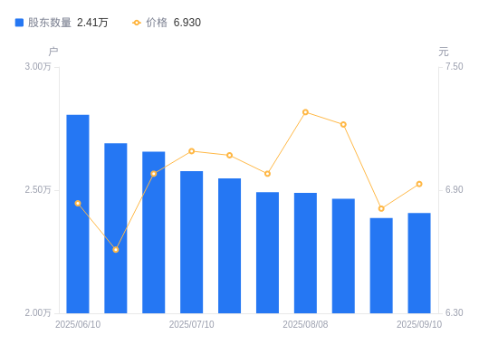 近一年(2024年9月20日至2025年9月10日),天禾股份A股股东户数从3.59万户,减低至2.41万户,降幅32.98%,区间股价上涨39.27%。