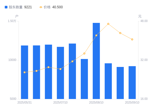 近一年(2024年9月30日至2025年9月10日),朗特智能A股股东户数从1.3万户,减低至9221户,降幅29.28%,区间股价上涨76.86%。