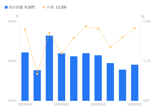 近一年(2024年9月10日至2025年9月10日),湖南发展A股股东户数从5.99万户,增加至6.28万户,增幅4.84%,区间股价上涨60.39%。