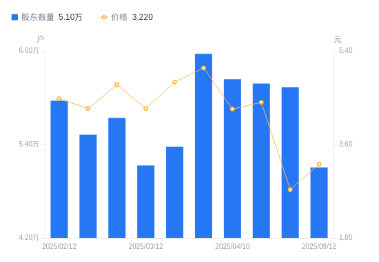 近一年(2024年9月21日至2025年9月12日),ST华西A股股东户数从6.63万户,减低至5.1万户,降幅22.99%,区间股价上涨31.97%。
