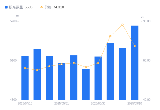 近一年(2024年9月30日至2025年9月10日),安杰思A股股东户数从5657户,减低至5635户,降幅0.39%,区间股价上涨36.28%。