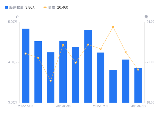 近一年(2024年9月30日至2025年9月10日),酷特智能A股股东户数从1.84万户,增加至3.86万户,增幅109.28%,区间股价上涨121.67%。