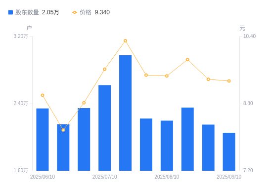 近一年(2024年9月20日至2025年9月10日),浔兴股份A股股东户数从1.44万户,增加至2.05万户,增幅42.81%,区间股价上涨35.17%。