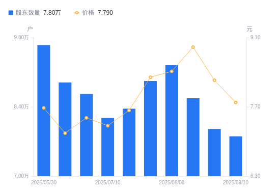 近一年(2024年9月20日至2025年9月10日),远东传动A股股东户数从6.69万户,增加至7.8万户,增幅16.73%,区间股价上涨62.97%。
