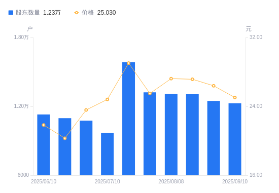 近一年(2024年9月10日至2025年9月10日),聚杰微纤A股股东户数从9550户,增加至1.23万户,增幅28.41%,区间股价上涨143.72%。