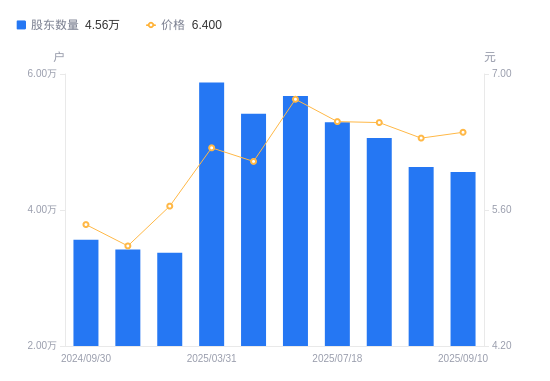 近一年(2024年9月30日至2025年9月10日),太阳电缆A股股东户数从3.56万户,增加至4.56万户,增幅28.02%,区间股价上涨28.00%。