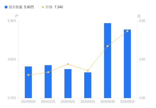 近一年(2024年9月30日至2025年9月10日),金牛化工A股股东户数从4.18万户,增加至5.9万户,增幅41.31%,区间股价上涨77.72%。