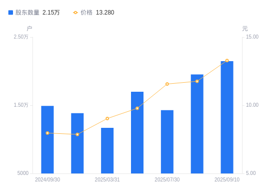 9月17日消息,数据显示,截至2025年8月29日,胜通能源A股股东总户数为1.95万户,较上期(2025年7月30日)增加5248户,增幅36.76%。公司最新A股总股本为2.82亿股,其中流通A股7056万股,户均持有流通A股数量为3614.2股,较上期减少1328.71股,降幅26.88%;户均持流通A股市值4.25万元,较上期减少1.46万元,降幅25.62%。