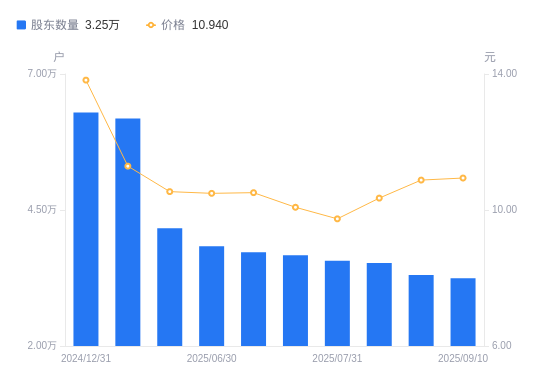 近一年(2024年9月30日至2025年9月10日),*ST智胜A股股东户数从4.61万户,减低至3.25万户,降幅29.55%,区间股价上涨0.92%。