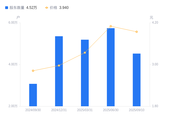 近一年(2024年9月30日至2025年9月10日),高乐股份A股股东户数从3.07万户,增加至4.52万户,增幅47.16%,区间股价上涨52.12%。