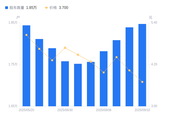 近一年(2024年9月30日至2025年9月10日),*ST宁科A股股东户数从2.88万户,减低至1.85万户,降幅35.88%,区间股价上涨79.61%。