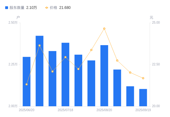9月22日消息,数据显示,截至2025年9月19日,双飞集团A股股东总户数为2.1万户,较上期(2025年9月10日)减少159户,降幅0.75%。公司最新A股总股本为2.18亿股,其中流通A股1.25亿股,户均持有流通A股数量为5954.9股,较上期增加44.67股,增幅0.76%;户均持流通A股市值12.91万元,较上期减少1040.94元,降幅0.80%。