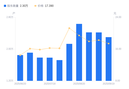 近一年(2024年9月30日至2025年9月19日),德恩精工A股股东户数从2.21万户,增加至2.3万户,增幅3.94%,区间股价上涨22.46%。