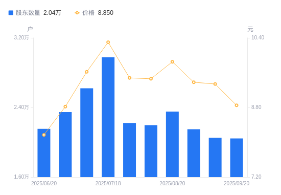近一年(2024年9月20日至2025年9月20日),浔兴股份A股股东户数从1.44万户,增加至2.04万户,增幅42.19%,区间股价上涨28.08%。