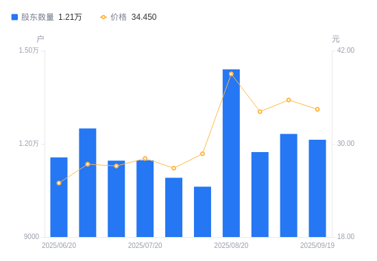 近一年(2024年9月20日至2025年9月19日),祥明智能A股股东户数从1.2万户,增加至1.21万户,增幅1.42%,区间股价上涨102.17%。