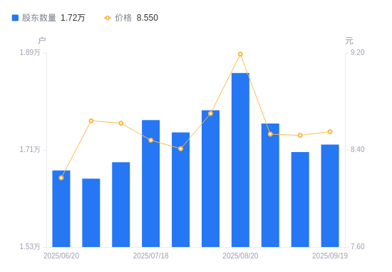 近一年(2024年9月30日至2025年9月19日),上海艾录A股股东户数从8765户,增加至1.72万户,增幅96.21%,区间股价下跌21.05%。