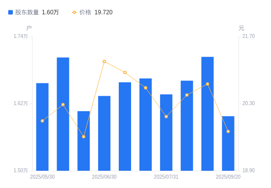 近一年(2024年9月30日至2025年9月20日),迦南智能A股股东户数从1.99万户,减低至1.6万户,降幅19.68%,区间股价上涨2.12%。