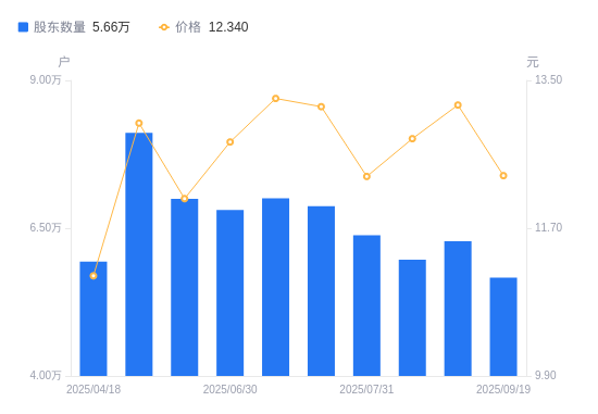 近一年(2024年9月20日至2025年9月19日),湖南发展A股股东户数从6.06万户,减低至5.66万户,降幅6.53%,区间股价上涨42.82%。