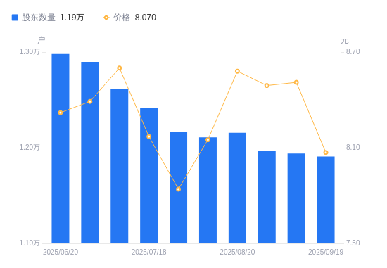 近一年(2024年9月20日至2025年9月19日),*ST兰黄A股股东户数从2.31万户,减低至1.19万户,降幅48.37%,区间股价上涨42.08%。