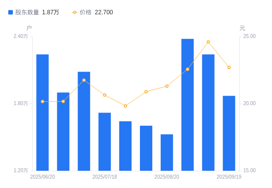 9月23日消息,数据显示,截至2025年9月19日,长江材料A股股东总户数为1.87万户,较上期(2025年9月10日)减少3699户,降幅16.51%。公司最新A股总股本为1.5亿股,其中流通A股7685.13万股,户均持有流通A股数量为4109.92股,较上期增加678.75股,增幅19.78%;户均持流通A股市值9.33万元,较上期增加8888.34元,增幅10.53%。