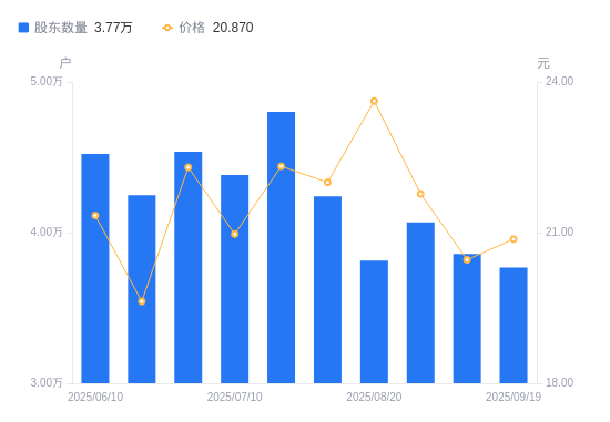 近一年(2024年9月30日至2025年9月19日),酷特智能A股股东户数从1.84万户,增加至3.77万户,增幅104.44%,区间股价上涨126.11%。
