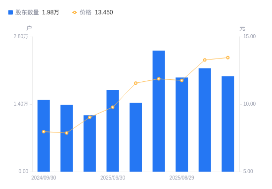 9月23日消息,数据显示,截至2025年9月19日,胜通能源A股股东总户数为1.98万户,较上期(2025年9月10日)减少1645户,降幅7.66%。公司最新A股总股本为2.82亿股,其中流通A股1.68亿股,户均持有流通A股数量为8466.6股,较上期增加648.61股,增幅8.30%;户均持流通A股市值11.39万元,较上期增加1.01万元,增幅9.68%。