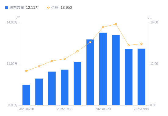 近一年(2024年9月20日至2025年9月19日),中科三环A股股东户数从10.54万户,增加至12.11万户,增幅14.93%,区间股价上涨71.59%。