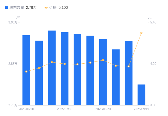 近一年(2024年9月30日至2025年9月19日),公元股份A股股东户数从3.25万户,减低至2.79万户,降幅14.11%,区间股价上涨22.01%。