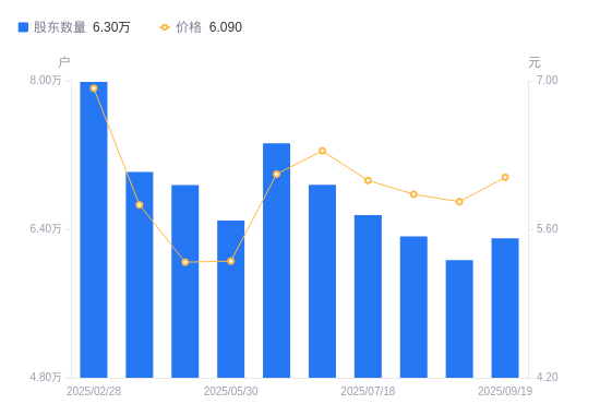 近一年(2024年9月30日至2025年9月19日),福能东方A股股东户数从4.02万户,增加至6.3万户,增幅56.92%,区间股价上涨60.26%。
