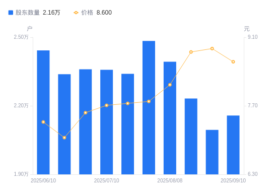 近一年(2024年9月20日至2025年9月19日),中辰股份A股股东户数从2.25万户,减低至2.17万户,降幅3.16%,区间股价上涨61.87%。