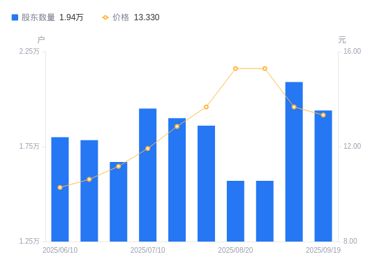 近一年(2024年9月30日至2025年9月19日),镇洋发展A股股东户数从2.05万户,减低至1.94万户,降幅5.48%,区间股价上涨67.99%。