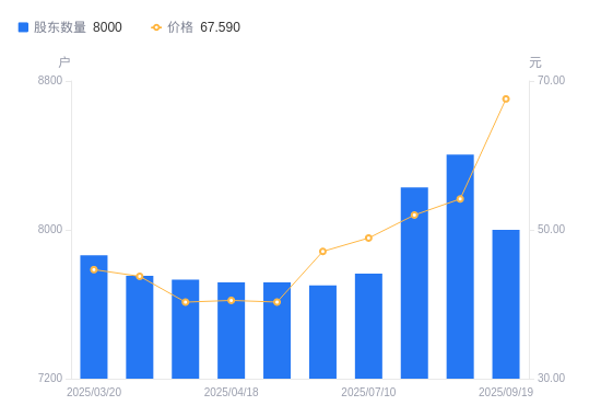 近一年(2024年9月30日至2025年9月19日),硕世生物A股股东户数从8236户,减低至8000户,降幅2.87%,区间股价上涨32.62%。