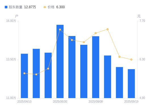 近一年(2024年9月30日至2025年9月19日),天海防务A股股东户数从10.33万户,增加至12.87万户,增幅24.66%,区间股价上涨60.71%。