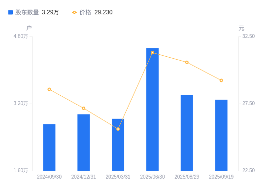 近一年(2024年9月30日至2025年9月19日),东方中科A股股东户数从2.71万户,增加至3.29万户,增幅21.53%,区间股价上涨12.53%。