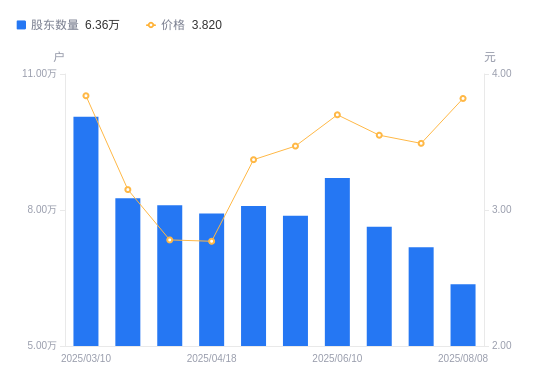 近一年(2024年9月30日至2025年8月8日),康盛股份A股股东户数从5.25万户,增加至6.36万户,增幅21.12%,区间股价上涨69.78%。