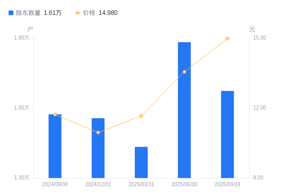 近一年(2024年9月30日至2025年9月24日),振华新材A股股东户数从1.53万户,增加至1.61万户,增幅5.49%,区间股价上涨51.31%。