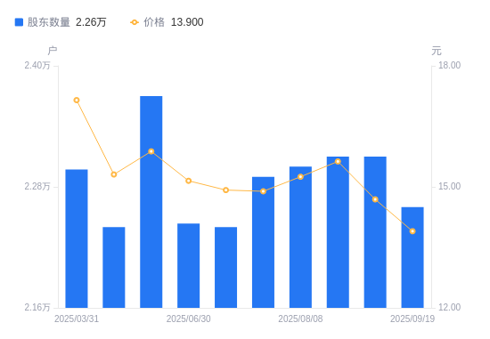 近一年(2024年9月20日至2025年9月19日),科思股份A股股东户数从1.77万户,增加至2.26万户,增幅27.68%,区间股价下跌16.91%。