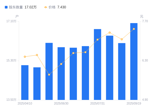 近一年(2024年9月30日至2025年9月19日),山西焦煤A股股东户数从11.59万户,增加至17.02万户,增幅46.88%,区间股价下跌13.60%。