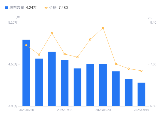 近一年(2024年9月30日至2025年9月19日),富瑞特装A股股东户数从4.47万户,减低至4.24万户,降幅5.16%,区间股价上涨22.22%。