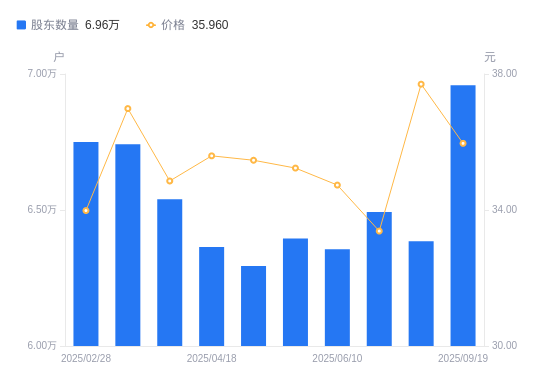 9月29日消息,数据显示,截至2025年9月19日,洪都航空A股股东总户数为6.96万户,较上期(2025年6月30日)增加5739户,增幅8.99%。公司最新A股总股本为7.17亿股,其中流通A股7.17亿股,户均持有流通A股数量为1.03万股,较上期减少926.24股,降幅8.25%;户均持流通A股市值37.06万元,较上期减少5.28万元,降幅12.48%。