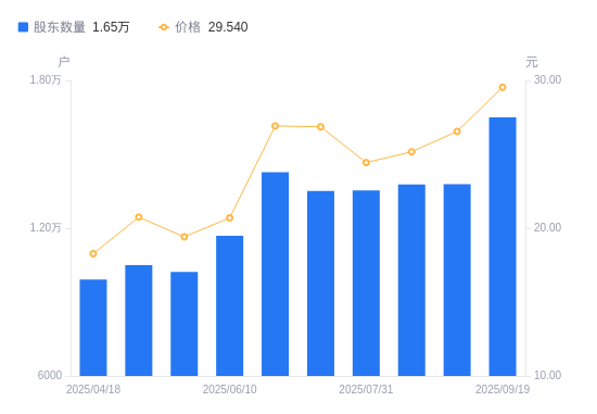 近一年(2024年9月30日至2025年9月19日),天山电子A股股东户数从1.25万户,增加至1.65万户,增幅31.63%,区间股价上涨143.03%。