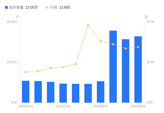 近一年(2024年9月10日至2025年9月10日),西藏天路A股股东户数从9.99万户,增加至22万户,增幅120.24%,区间股价上涨157.58%。